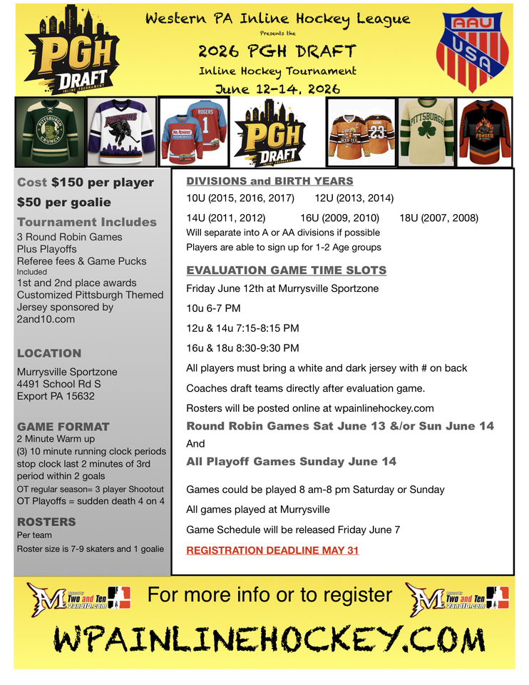 PGH Draft 2026Register Here for PGH Draft Tournament June 12-14,2026Scroll down on page to check out the New PGH Jerseys for 2026